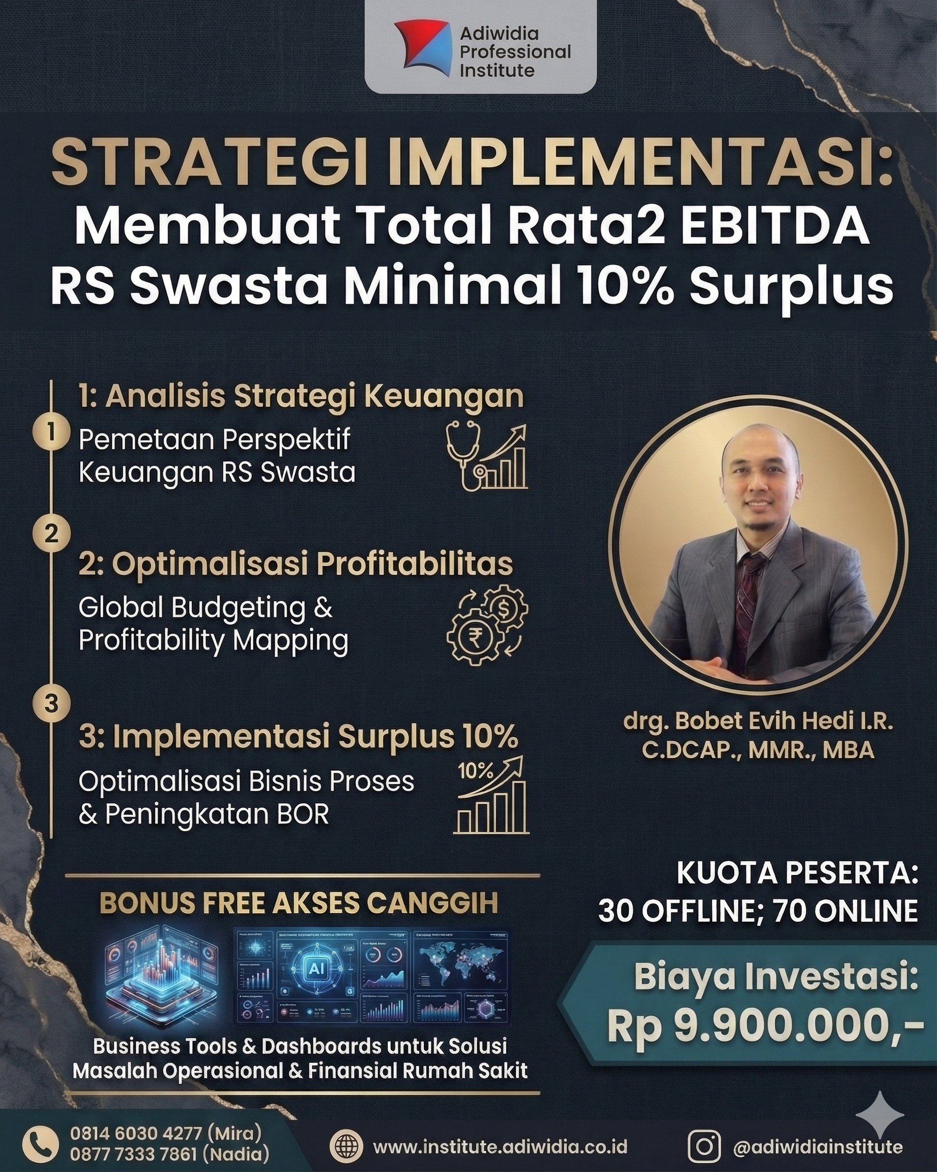 Bootcamp ini akan dibedah langsung oleh narasumber ahli kami, drg. Bobet Evih Hedi I.R, C.DCAP., MMR., MBA, seorang praktisi dan akademisi dengan kredensial kuat dalam manajemen medis, keuangan strategis, dan administrasi rumah sakit.