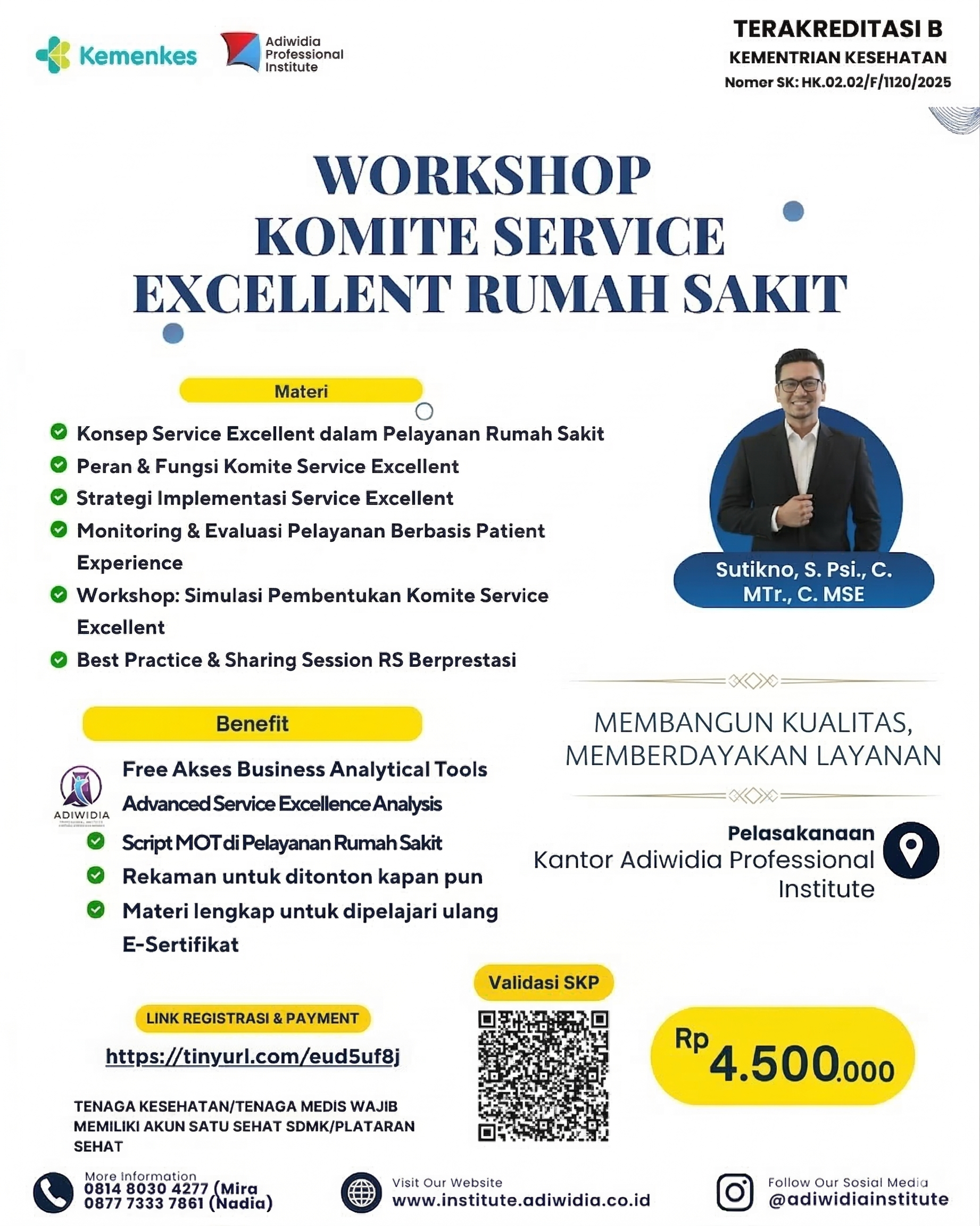 Workshop “Komite Service Excellent Rumah Sakit” merupakan pelatihan profesional yang dirancang untuk memperkuat peran dan fungsi Komite Service Excellent dalam meningkatkan mutu pelayanan di rumah sakit. Melalui workshop ini, peserta akan mempelajari strategi implementasi budaya pelayanan prima, manajemen kepuasan pasien, serta peran komite dalam mengawasi dan memastikan standar pelayanan dijalankan secara konsisten oleh seluruh unit rumah sakit. Materi akan mencakup pembahasan mengenai konsep dasar service excellence di sektor kesehatan, penyusunan standar pelayanan berbasis patient-centered care, teknik komunikasi efektif bagi tenaga medis dan non-medis, serta mekanisme evaluasi dan tindak lanjut keluhan pasien. Kegiatan ini dirancang untuk anggota komite pelayanan, manajer mutu, kepala instalasi, serta pimpinan rumah sakit yang ingin memperkuat sistem pelayanan prima secara berkelanjutan. dilaksanakan selama 2 hari dengan metode tatap muka (offline)
