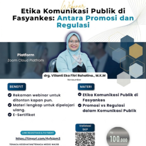 Webinar “Etika Komunikasi Publik di Fasyankes: Antara Promosi dan Regulasi” adalah pelatihan yang membahas prinsip dan batasan dalam menyampaikan informasi kesehatan secara etis, akurat, dan sesuai regulasi. Peserta akan mempelajari strategi komunikasi publik yang bertanggung jawab, cara membuat pesan yang tidak menyesatkan, pemanfaatan media digital secara etis, serta upaya ...