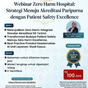 Webinar “Zero Harm Hospital: Strategi Menuju Akreditasi Paripurna dengan Patient Safety Excellence” membahas strategi implementasi keselamatan pasien untuk mencapai akreditasi paripurna. Peserta akan mempelajari langkah-langkah penting dalam menciptakan rumah sakit yang aman bagi pasien, membangun budaya keselamatan, mengidentifikasi potensi risiko, serta mengimplementasikan kebijakan yang mendukung keselamatan dalam pelayanan kesehatan.