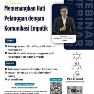 Webinar "Memenangkan Hati Pelanggan dengan Komunikasi Empatik" adalah pelatihan untuk meningkatkan keterampilan komunikasi empatik dalam pelayanan pelanggan. Peserta akan belajar cara mendengarkan dengan penuh perhatian, memahami kebutuhan pelanggan, serta merespons dengan empati untuk menciptakan pengalaman yang memuaskan.