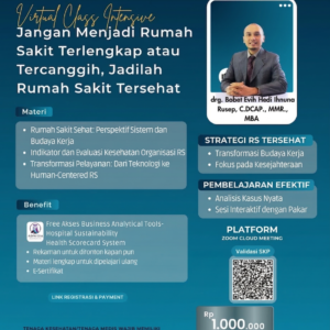 Webinar “Jangan Menjadi Rumah Sakit Terlengkap atau Tercanggih, Jadilah Rumah Sakit Tersehat” merupakan kegiatan reguler bersertifikat SKP yang membahas strategi membangun rumah sakit berorientasi pada health sustainability