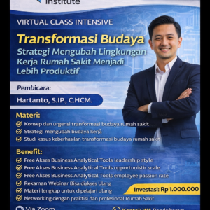 Webinar “Transformasi Budaya: Strategi Mengubah Lingkungan Kerja Rumah Sakit Menjadi Lebih Produktif” adalah pelatihan yang membahas cara membangun budaya kerja yang kolaboratif, profesional, dan adaptif di lingkungan rumah sakit. Peserta akan mempelajari strategi komunikasi efektif, manajemen perubahan, serta penerapan nilai organisasi untuk meningkatkan kinerja tim dan kualitas layanan.