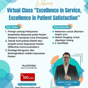 Kelas Virtual "Keunggulan dalam Pelayanan, Keunggulan dalam Kepuasan Pasien" adalah pelatihan profesional yang berfokus pada peningkatan kualitas pelayanan dan kepuasan pasien melalui penerapan prinsip-prinsip keunggulan pelayanan. Peserta akan mempelajari komunikasi empatik, manajemen keluhan, dan strategi untuk membangun pengalaman pasien yang positif dan profesional. Kelas ini dirancang untuk pekerja kesehatan ...