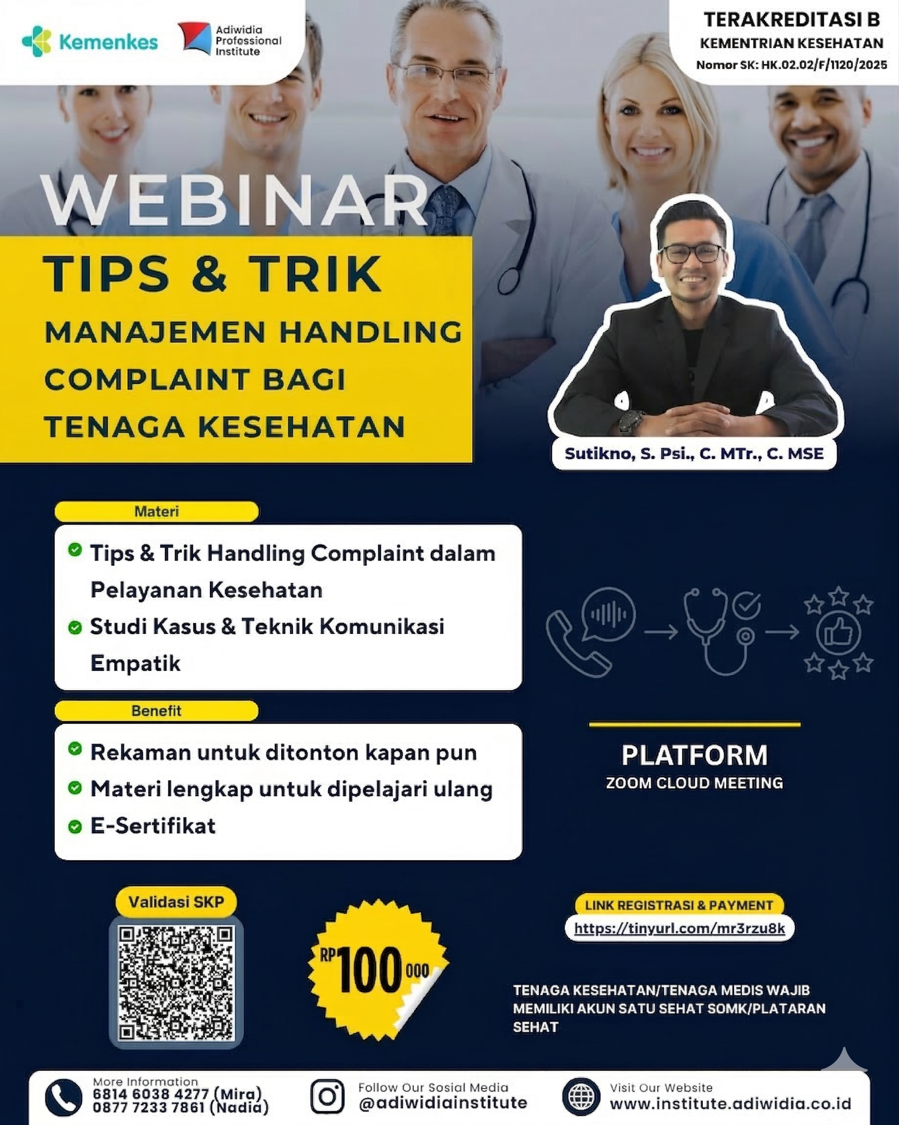 Webinar “Tips & Trik Handling Complaint dalam Pelayanan Kesehatan” merupakan kegiatan edukatif yang membahas strategi efektif dalam menangani keluhan dan komplain pasien di fasilitas pelayanan kesehatan. Webinar ini dirancang untuk meningkatkan kemampuan tenaga kesehatan dan staf pelayanan dalam menghadapi berbagai jenis keluhan pasien secara profesional, empatik, dan solutif guna menjaga mutu layanan serta kepercayaan masyarakat. Dalam webinar ini, peserta akan mempelajari teknik komunikasi efektif, pendekatan pelayanan berorientasi pada pasien, serta strategi penyelesaian komplain yang sesuai dengan standar pelayanan kesehatan. Materi mencakup pemahaman karakteristik pasien, pengelolaan emosi dalam menghadapi komplain, teknik meredam konflik, hingga langkah-langkah preventif untuk meminimalkan keluhan berulang.