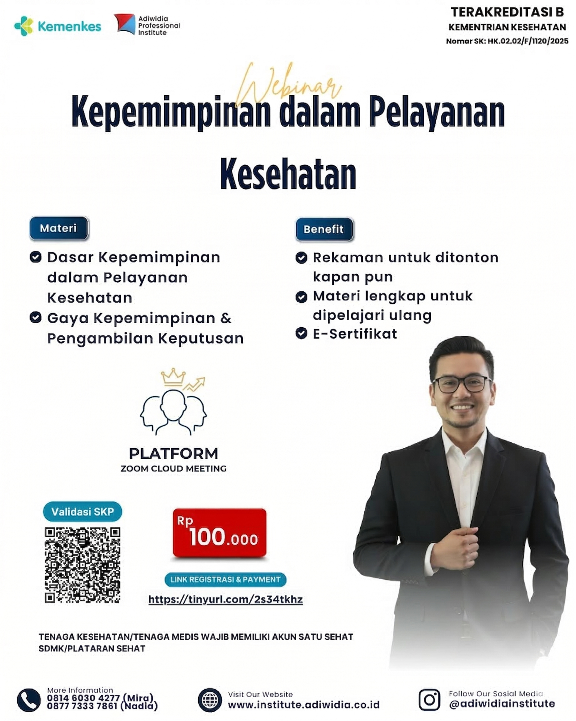Webinar “Kepemimpinan dalam Pelayanan Kesehatan” adalah pelatihan yang bertujuan untuk meningkatkan keterampilan kepemimpinan dalam konteks pelayanan kesehatan. Dalam webinar ini, peserta akan mempelajari bagaimana menjadi pemimpin yang efektif dalam lingkungan rumah sakit atau fasilitas kesehatan, serta cara mengambil keputusan strategis yang mendukung kualitas pelayanan dan kesejahteraan pasien. Materi mencakup prinsip-prinsip kepemimpinan yang berbasis pada etika, komunikasi yang efektif, dan pengelolaan tim dalam situasi yang penuh tekanan. Webinar ini juga akan memberikan wawasan mengenai pentingnya kolaborasi antar profesional medis dan non-medis serta bagaimana menciptakan budaya kerja yang positif dan produktif. Kegiatan ini sangat cocok untuk manajer rumah sakit, kepala departemen medis, serta profesional yang terlibat dalam pengelolaan pelayanan kesehatan yang ingin memperdalam pemahaman mereka mengenai peran kepemimpinan yang efektif.