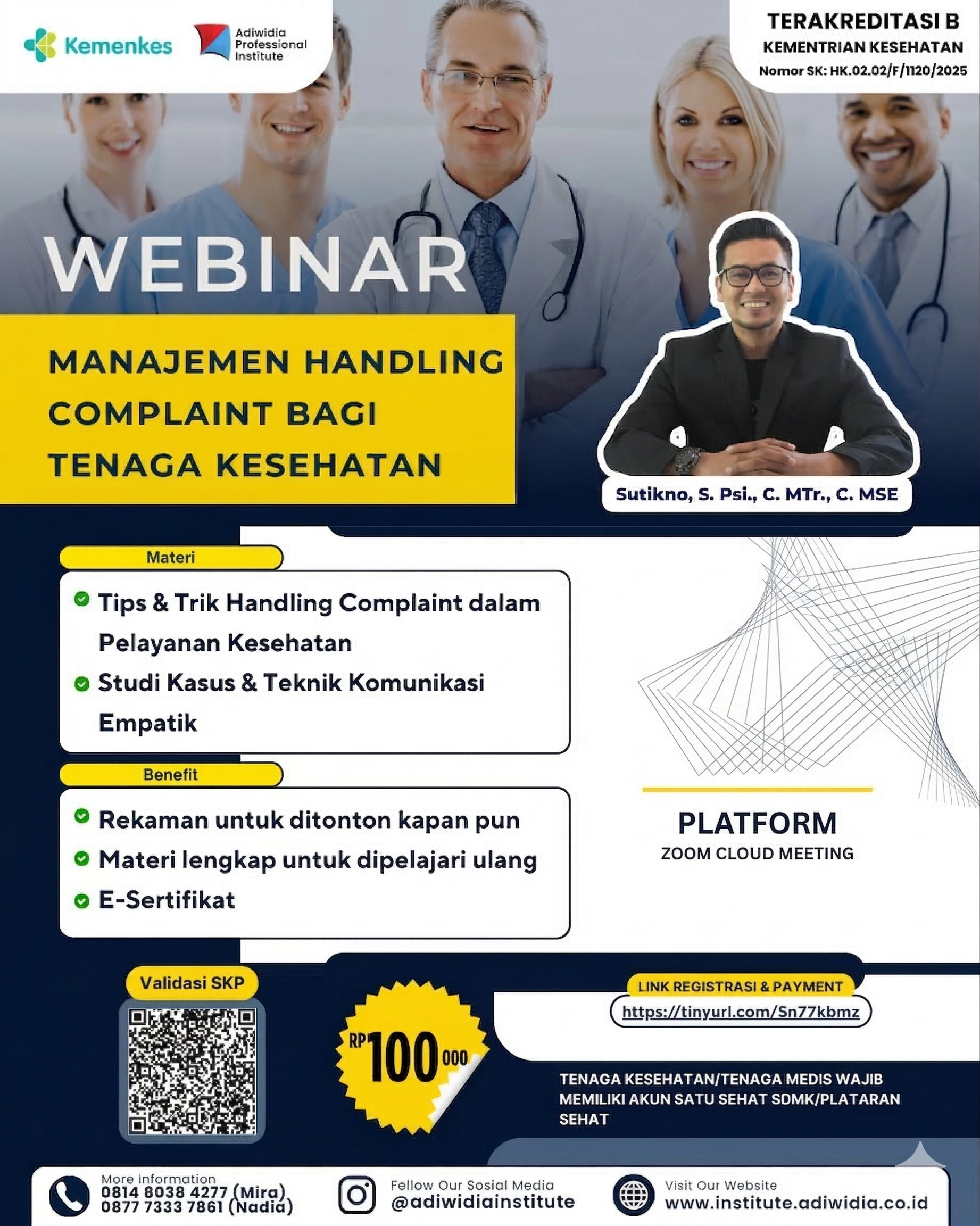 Webinar “Manajemen Handling Complaint bagi Tenaga Kesehatan” adalah pelatihan yang membahas strategi efektif dalam menangani keluhan pasien dan keluarga di fasilitas pelayanan kesehatan. Dalam webinar ini, peserta akan mempelajari teknik komunikasi yang profesional, empatik, serta cara menyelesaikan masalah dengan tepat agar menciptakan pengalaman pelayanan yang lebih baik dan menjaga reputasi institusi. Materi webinar mencakup pengenalan jenis-jenis keluhan pasien, strategi komunikasi efektif dalam menangani keluhan, teknik resolusi konflik, serta cara mencegah keluhan berulang melalui perbaikan pelayanan. Pendekatan ini diharapkan dapat membantu tenaga kesehatan meningkatkan kualitas interaksi dengan pasien, menjaga kepuasan pasien, dan membangun lingkungan pelayanan yang harmonis. Kegiatan ini dirancang bagi tenaga kesehatan, tenaga medis dan non-medis, manajer pelayanan, serta individu yang ingin meningkatkan kompetensi dalam menangani keluhan pasien secara profesional. Webinar akan menghadirkan narasumber berpengalaman di bidang pelayanan kesehatan dan manajemen kualitas, dilengkapi dengan sesi interaktif, tanya jawab, dan tips praktis yang dapat diterapkan dalam kegiatan sehari-hari.