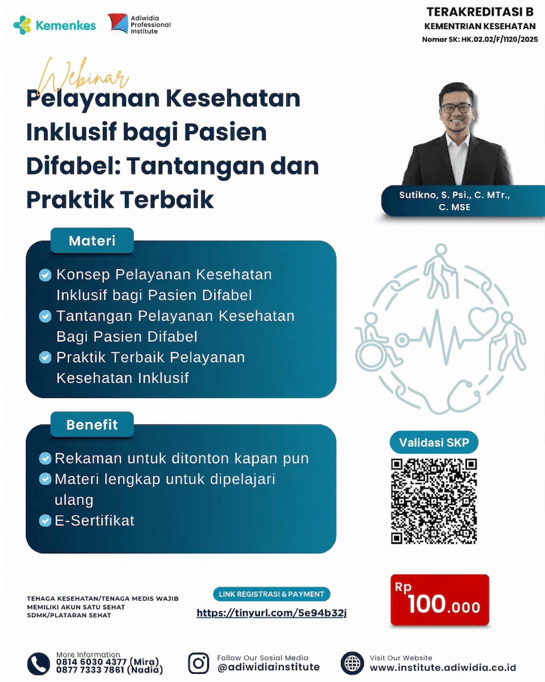 Webinar “Pelayanan Kesehatan Inklusif bagi Pasien Difabel: Tantangan dan Praktik Terbaik” adalah pelatihan yang membahas strategi pelayanan kesehatan yang inklusif dan ramah bagi pasien dengan disabilitas. Dalam webinar ini, peserta akan mempelajari cara memberikan pelayanan yang adil, empatik, dan aman, serta memahami kebutuhan khusus pasien difabel agar kualitas pelayanan tetap optimal. Materi yang disampaikan mencakup prinsip pelayanan kesehatan inklusif, identifikasi tantangan dan hambatan yang dihadapi pasien difabel, teknik komunikasi efektif, serta praktik terbaik dalam memberikan layanan yang adaptif dan humanis. Pendekatan ini diharapkan membantu tenaga kesehatan meningkatkan aksesibilitas, kepuasan pasien, dan menciptakan lingkungan pelayanan yang lebih inklusif. Kegiatan ini dirancang bagi tenaga kesehatan, tenaga medis dan non-medis, manajer fasilitas kesehatan, serta individu yang ingin memahami praktik pelayanan inklusif. Webinar akan menghadirkan narasumber berpengalaman di bidang pelayanan kesehatan inklusif, dilengkapi dengan sesi interaktif, tanya jawab, dan tips praktis yang dapat diterapkan dalam pelayanan sehari-hari.