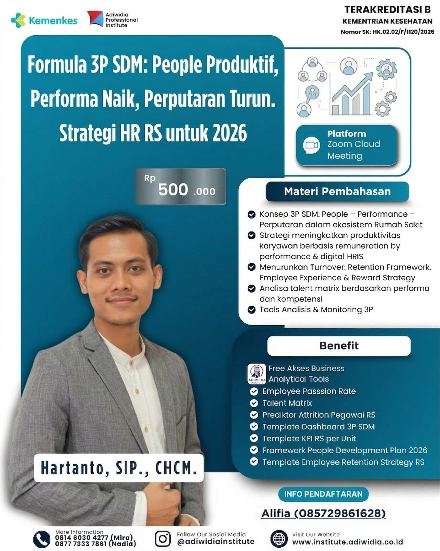 Virtual Class Intensive “Formula 3P: Pasien Penuh, Profit Naik, Pesaing Mundur. Rencana Perang Rumah Sakit di 2026” adalah pelatihan strategis yang membahas bagaimana rumah sakit dapat merancang strategi pemasaran dan manajemen layanan untuk memenangkan persaingan di era baru industri kesehatan. Kegiatan ini berfokus pada penerapan Formula 3P yaitu menarik Pasien Penuh, meningkatkan Profit, dan membuat Pesaing Mundur melalui pendekatan branding, digital marketing, serta optimalisasi pengalaman pasien (patient experience). Dalam pelatihan ini, peserta akan mempelajari strategi praktis untuk memperkuat posisi kompetitif rumah sakit, mengelola citra merek kesehatan, meningkatkan loyalitas pasien, serta menyusun rencana bisnis rumah sakit yang berorientasi pada pertumbuhan berkelanjutan.