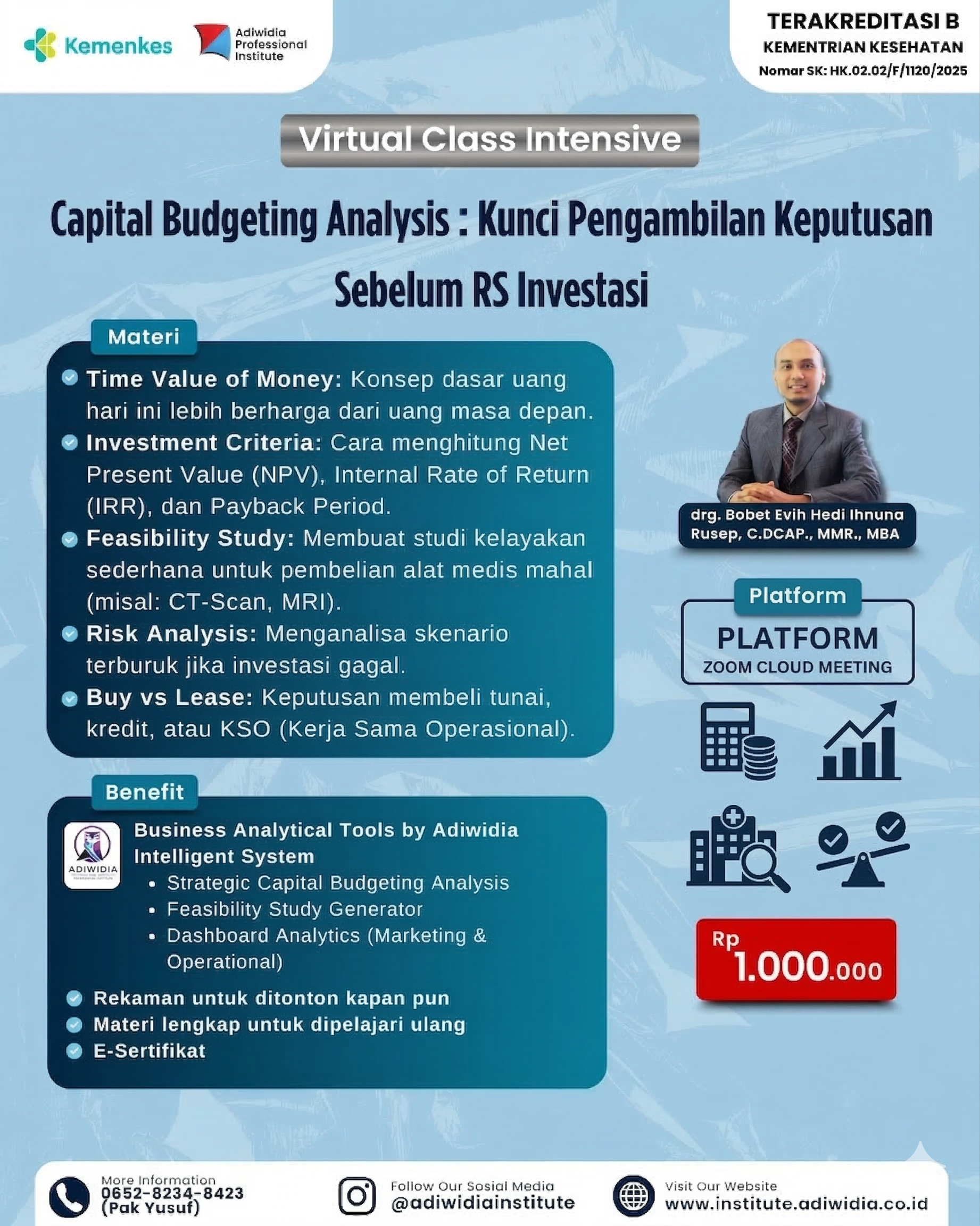 Webinar “Capital Budgeting Analysis: Kunci Pengambilan Keputusan Sebelum RS Investasi” adalah pelatihan yang membahas strategi dan teknik analisis keuangan yang digunakan dalam proses pengambilan keputusan investasi rumah sakit. Dalam webinar ini, peserta akan mempelajari bagaimana melakukan evaluasi kelayakan investasi melalui metode capital budgeting seperti NPV, IRR, Payback Period, dan Profitability Index. Materi mencakup cara mengidentifikasi risiko investasi, menghitung estimasi biaya serta manfaat jangka panjang, dan menentukan alternatif investasi terbaik untuk pengembangan fasilitas kesehatan.