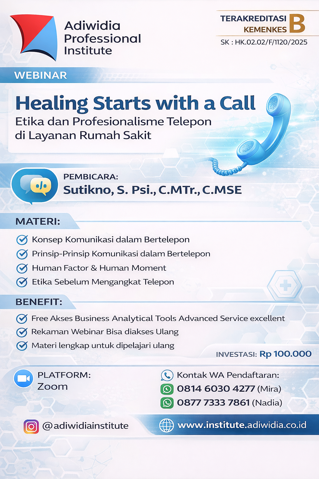 Webinar “Healing Starts with a Call: Etika dan Profesionalisme Telepon di Layanan Rumah Sakit” merupakan pelatihan profesional yang dirancang untuk meningkatkan kualitas komunikasi petugas rumah sakit dalam memberikan pelayanan melalui media telepon. Webinar ini membahas prinsip-prinsip etika berkomunikasi (telephone courtesy), teknik komunikasi verbal yang efektif, serta cara membangun kesan profesional, ramah, dan empatik kepada pasien maupun keluarga pasien melalui layanan telepon. Dalam webinar ini, peserta akan mempelajari standar pelayanan komunikasi telepon di rumah sakit, penggunaan intonasi suara yang tepat, pemilihan kata yang sopan dan jelas, serta teknik menangani keluhan dan situasi sulit secara profesional. Materi juga mencakup pengelolaan emosi, peningkatan kepuasan pasien, dan penguatan citra positif rumah sakit melalui pelayanan komunikasi yang prima. Kegiatan ini dirancang untuk tenaga kesehatan, petugas administrasi, customer service rumah sakit, operator telepon, serta seluruh staf rumah sakit yang terlibat dalam pelayanan informasi melalui telepon.
