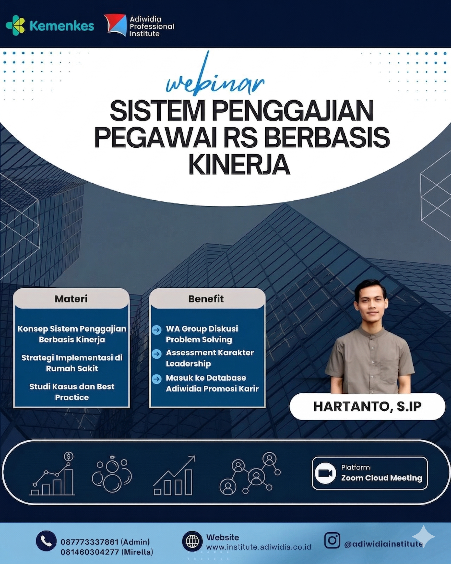 Webinar “Sistem Penggajian Pegawai RS Berbasis Kinerja” adalah program edukasi yang membahas konsep dan implementasi sistem penggajian berbasis kinerja di rumah sakit. Dalam webinar ini, peserta akan mempelajari bagaimana menyusun dan mengelola skema penggajian yang adil, transparan, dan berbasis pencapaian kinerja pegawai. Materi akan mencakup prinsip dasar remunerasi berbasis kinerja, indikator penilaian kinerja (KPI), strategi penerapan di lingkungan rumah sakit, serta tantangan dan solusi dalam implementasinya. Kegiatan ini dirancang untuk manajer rumah sakit, staf HRD, pengelola SDM, pimpinan klinik, dan pihak terkait yang ingin meningkatkan efektivitas manajemen kompensasi agar sejalan dengan peningkatan produktivitas dan kualitas layanan rumah sakit. Webinar akan menghadirkan narasumber ahli di bidang manajemen SDM kesehatan, memberikan sesi interaktif, diskusi studi kasus, serta tips praktis yang dapat langsung diterapkan.