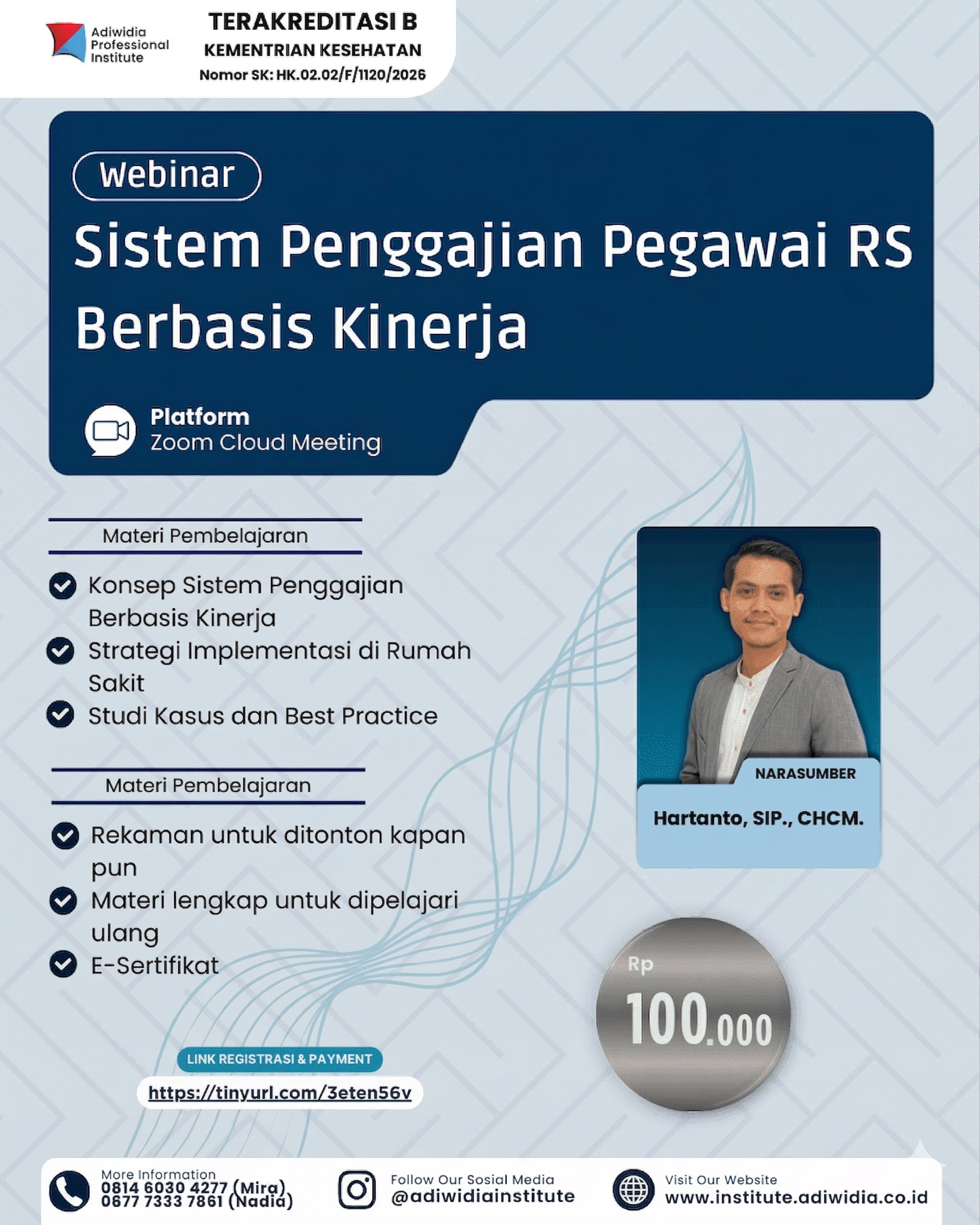 Webinar “Sistem Penggajian Pegawai RS Berbasis Kinerja” adalah pelatihan yang membahas penerapan sistem remunerasi rumah sakit yang adil, transparan, dan berorientasi pada kinerja. Dalam webinar ini, peserta akan mempelajari konsep dasar remunerasi berbasis kinerja, komponen-komponen penggajian pegawai rumah sakit, serta metode penilaian kinerja yang efektif. Materi mencakup penyusunan indikator kerja, perhitungan insentif, pengelolaan beban kerja, hingga strategi meningkatkan motivasi pegawai melalui sistem penggajian yang tepat. Kegiatan ini dirancang untuk manajemen rumah sakit, bagian keuangan dan SDM, serta praktisi kesehatan yang ingin memahami implementasi sistem penggajian berbasis kinerja secara aplikatif dan sesuai regulasi.